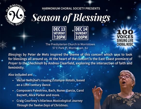 Ginny will be singing in “Season of Blessings” which includes Renaissance polyphony, contemporary premieres, bluegrass harmonies, and chamber orchestra. Featuring the East Coast premiere of Prayer to the Shechinah by Andrea Clearfield, celebrating the divine feminine, and Václav Nelhýbel’s rousing Estampie Natalis. Plus works by Palestrina, Bach, Nunes Garcia, Carol Barnett, Alice Parker and Craig Courtney’s hilarious Musicological Journey Through the Twelve Days of Christmas.