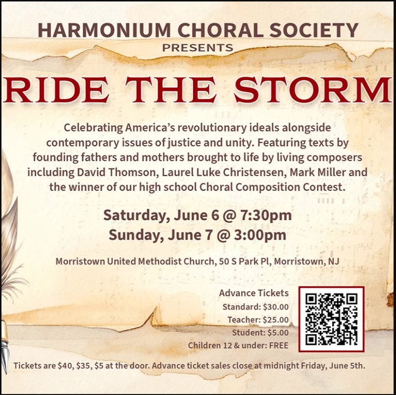 Ride the Storm celebrates America’s revolutionary ideals and today’s pressing questions of identity, justice, and unity. Featuring powerful new settings of texts by Alexander Hamilton, Abigail Adams, Benjamin Franklin, Thomas Paine and Lafayette—brought to life by composers including David Thomson, Melissa Dunphy, Jackson Berkey, Laurel Luke Christensen, Mark Miller and the winning composers of our 29th annual NJ HS Choral Composition Contest.